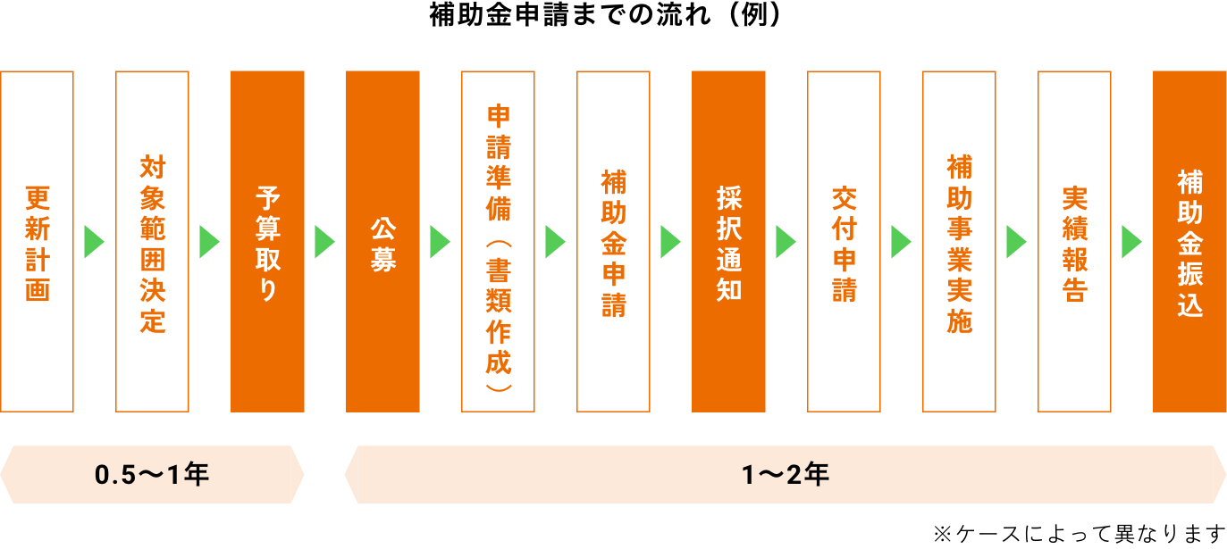アストモスエネルギーでは、設備更新や燃料転換を検討する事業者向けに、国・自治体が公募する省エネ・脱炭素・防災関連補助金を活用したLPガス導入支援を行っています。対象制度の調査、採択を見据えた計画書作成、申請手続き、交付申請、実績報告、振込確認までワンストップで支援し、書類作成や官公庁とのやり取りに要する負担を削減します。