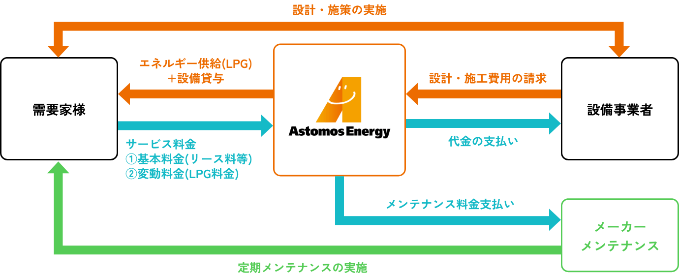 アストモスエネルギーのESPスキームは、この課題を包括的に解決します。導入時の初期費用が不要であることに加え、「エネルギー供給」「設計・施工」「メンテナンス」を一括で担うため、需要家様はアストモスにサービス料金を支払うだけで運用が完結します。