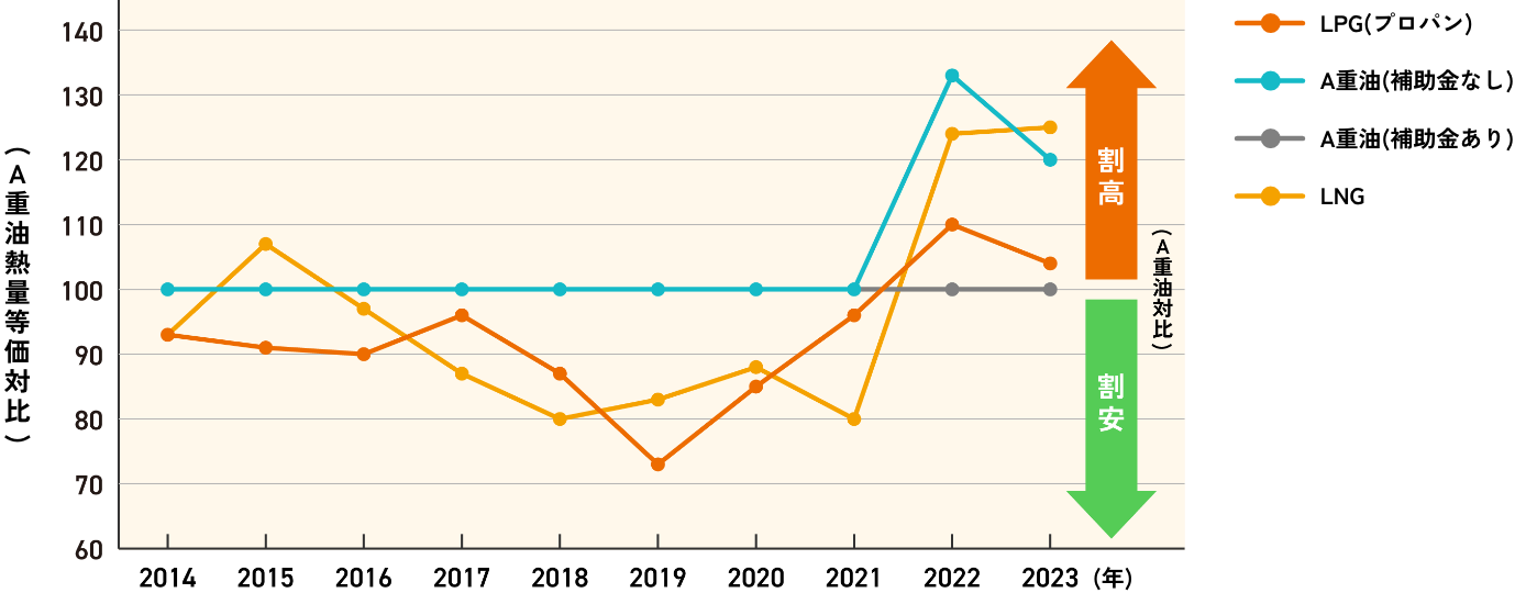※1 A重油対比でのLPG・LNGの熱量等価の推移(需要家様への持届価格)(アストモスエネルギー調べ)