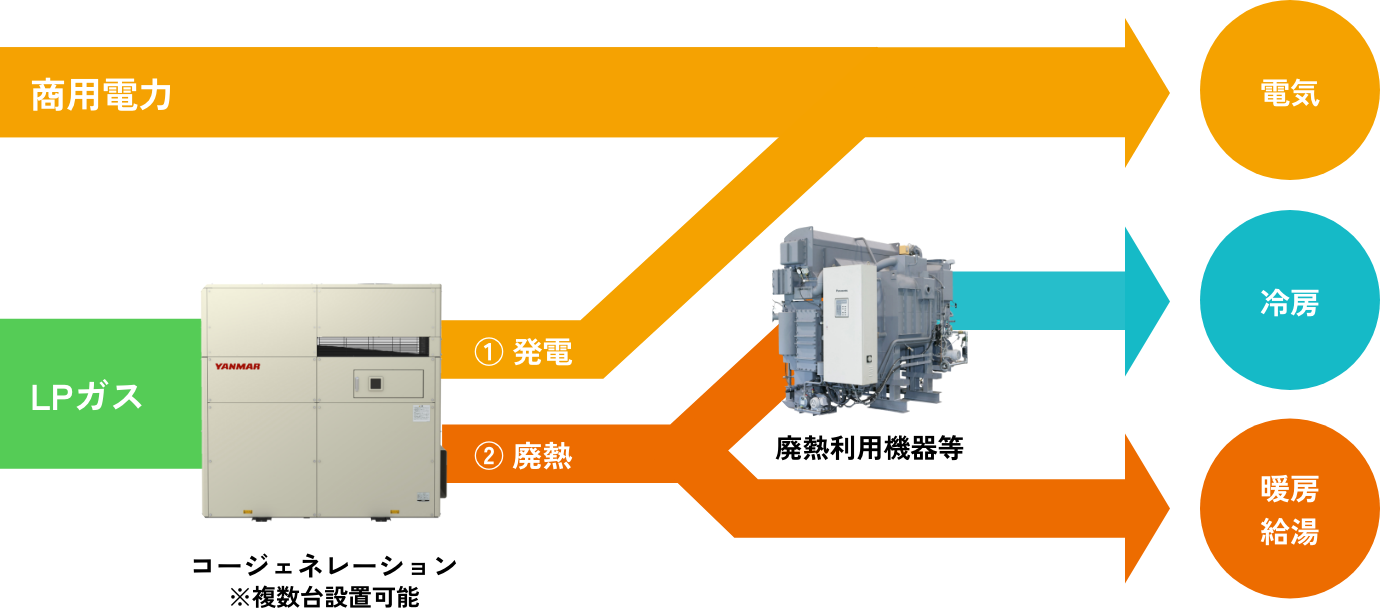 LPガスを燃料に発電し、廃熱を回収して冷暖房・給湯に再利用。